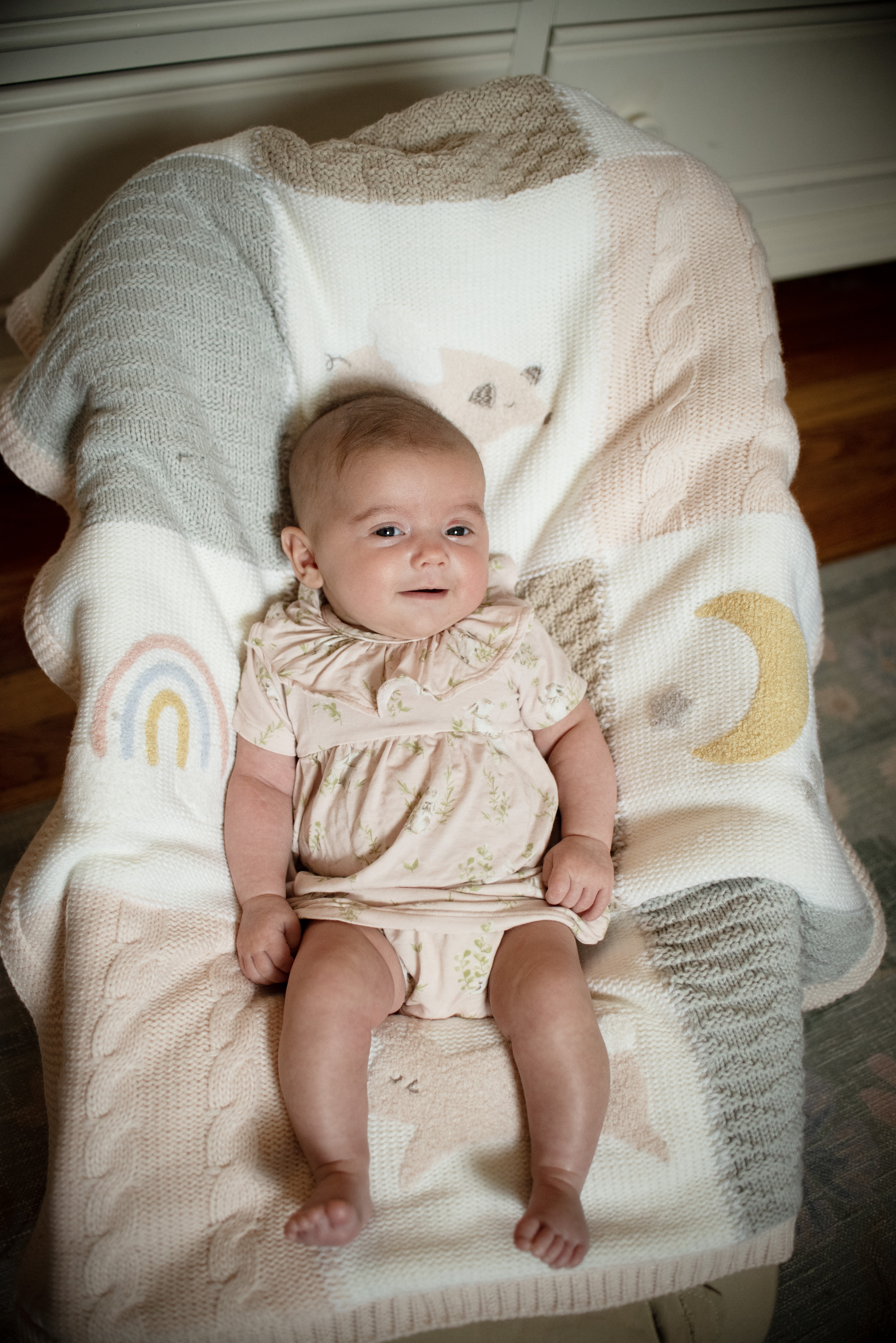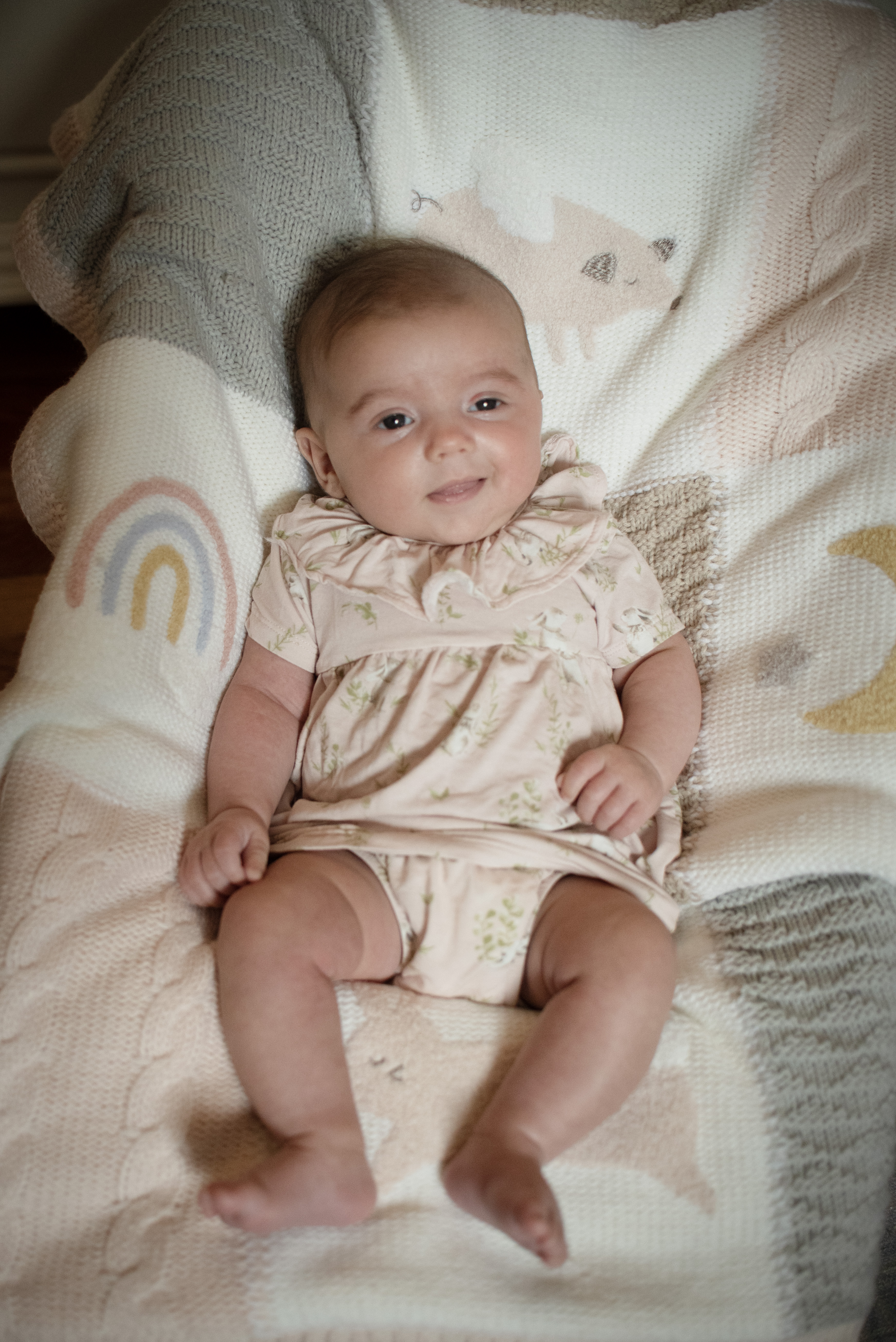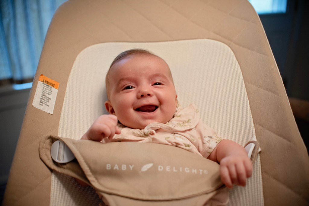 My sweet baby spends her days grinning more and more. She adores hearing a sing-songy voice, seeing our faces in the morning, and hearing happy tunes. She is looking more at our eyes and our mouths, and it’s so sweet to see true joy across her face.